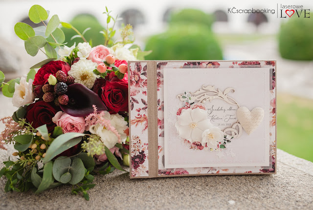 Pre rodičov sme vymysleli sadu darčekov - kyticu, ďakovné srdiečko s našou grafikou a svadobný album. Album som tiež ladila do farieb svadby a zakomponovala som tam ozdobný rámik s prsteňmi od Laserowe Love. Keď vyvoláme fotečky, možno dozdobím aj vnútro jemnými výrezmi.